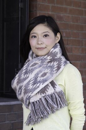 Cilou is a bulky and lush scarf knit in the beautiful shades of Cascade Yarns Eco Duo. The color pattern on the scarf was inspired by the slightly blurry the patterns created when the warp of an Ikat fabric is tied onto a loom.