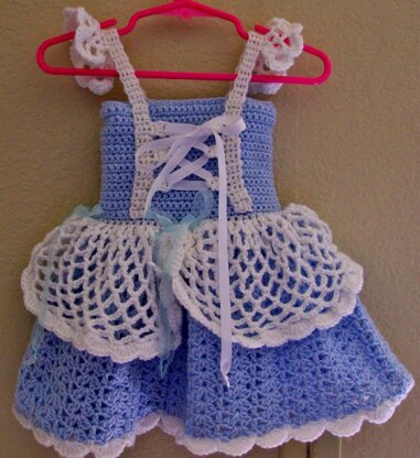 Pattern was inspired by a picture and a New grand coming along. The skirt can be adjusted by adding or deleting rows for the repeats. The dress includes four sizes and instructions for both crochet and ribbon straps for the front of the bodice. Dress is made with basic stitches worked from the top to the bottom.