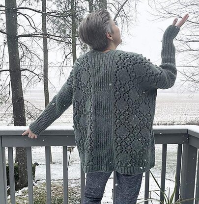 The body of this cardigan is worked back and forth in two separate identical panels that are then joined together to continue over the shoulder and work the back as one piece. A circular needle is used to accommodate the large number of stitches. Extra cir. needles are recommended for Kitchener BO. Sleeves are knit separately and joined to the body.