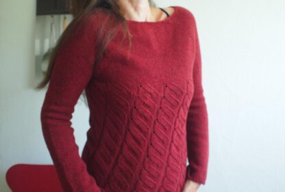 cinnabar cables is a seamless scoop neck sweater with circular yoke, worked in rounds from top down. it starts with a small neck band in k1,p1 ribbing. for neckline shaping the pattern uses german short rows. the round yoke is shaped with slanted increases. when the yoke is done, markers are set for sleeves and body parts. after doing increases for sleeves and body and divide sleeves from body, the false cable pattern will start.