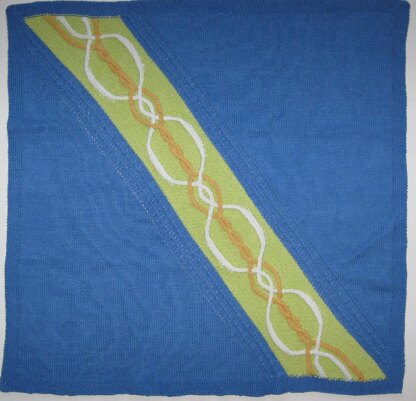 This blanket features a cable design, bracketed by a textured border, worked at an angle. The body of the blanket is stockinette with a narrow textured border. The design can be worked in a single color or using intarsia for the cable band.