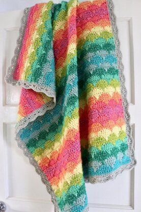 A rectangular baby blanket featuring my unique clamshell stitch pattern, which can be easily adapted for different yarn weights and sizes. Worked back and forth in rows with a border added around the edge.