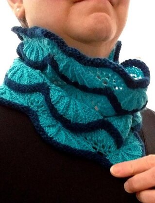 The beautiful scallop and ridges of this lace reminded me of that underwater phenomenon. Reverse stockinette ridges, special wrap stitches and the natural wave created in the bottom edge of each lace section mimics the troughs and ridges of the fracture zones. Knit in two colors of fingering weight yarn, it is a warm and elegant cowl.