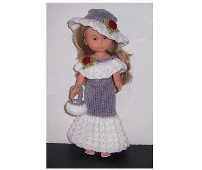 Clarisse This Les Cheries knitting pattern features a long knitted dress with a flared skirt and with a frill at the neckline. The neckline is decorated with a rose with 3 attached leavesThe dress has a 2 button back fastening. There is a complementing hat, which also is decorated with a rose. A handy little purse finishes the outfit This pattern is my own design