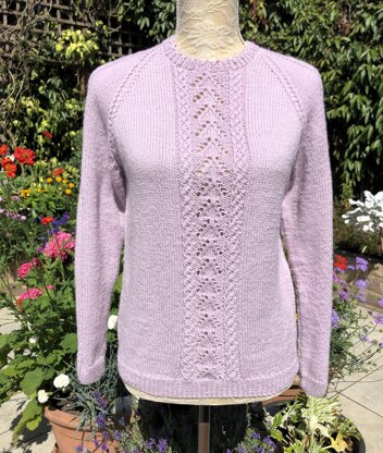 A perfect, timeless sweater for all seasons. With a beautiful lace and braid effect panel on the front, back and sleeves, single rib borders with pretty picot edge added to the neck, comfy raglans and an easy straight fit, this sweater will be a staple for any wardrobe. Worked bottom up and with full written instructions.