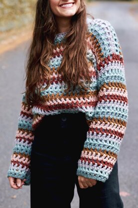 Inspired by my favorite character from The Babysitter’s Club, this funky multi-color pullover is definitely a statement piece. The open grid-like construction keeps this crochet sweater airy and drapey while the bulky weight yarn makes it a quick and easy project.