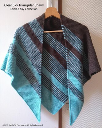 The shawl is worked from one of its shortest side as the starting edge, decreases are made the right edge of the work, thus creating an easy triangle. The colour blocks are designed such that when the shawl is worn, it forms an asymmetrical pattern at the back and a set of continuous slanted stripes in the front. The shawl is best worn with a waist belt or a shawl pin to make it a classic and elegant accessory. Tunisian Honeycomb Stitch pattern is used throughout the project, giving a subtle texture to the fabric, easy to create, and no worries of curling. Also this stitch pattern creates a good tweed with two colours for the transition block.