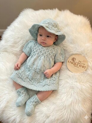 A pretty 3 piece dress set knitting pattern. The dress is knitted from the bottom up in one piece to the armholes, which helps reduce the amount of sewing required. The sleeves are knitted separately. and then sewn in. You pick up stitches for the neckband and button bands. The hat is knitted from the top down. The little booties are knitted from the bottom up. The whole set is knitted on straight needles with line-by-line instructions
