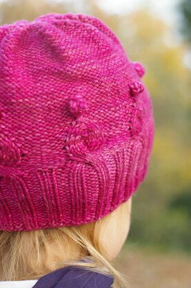 Combination of a simple couple of cables followed by a row of easy-to-knit bobbles. Who doesn’t like bobbles? They are fun to make and look super cute! The rest of hat is made in plain reverse stockinette.