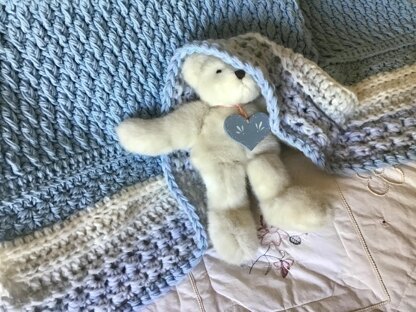 So warm and comfy in the Cloud Nine Baby Blanket. Texture beyond texture and totally reversible. Fits any decor in any room. Simple crochet stitches throughout.