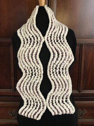 Several years ago I encountered a scarf pattern which used two yarns in very different thicknesses, but both the same color. When I recently recalled having made that scarf, I decided to use the same basic concept but add a bit of pizzazz. One of my quirks is that I prefer to knit scarves lengthwise, and so I combined the lengthwise knitting, the two diverse yarns, and a wavy stitch pattern. After it was completed, my extremely creative eight year old granddaughter looked at it and came up with the name Cloud River.