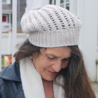 This slouch is made of fishnet-style eyelet pattern. A light, airy bulky, like a wool or wool blend chainette yarn, is recommended. You will be working the hat more tightly than the average gauge of the yarn, so choose a bulky yarn with a label gauge of 3.5 sts/inch.