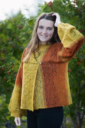 This is a cardigan or bolero in Tunisian crochet. It is light, soft and almost shawl like. The lace pattern makes the material quite elastic in all directions. The shown model is made in two colours, but you can also make the cardigan in one colour only.