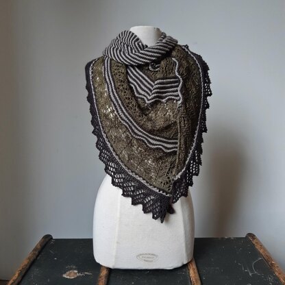Cluran (Gaelic for thistle) is a generous-sized triangle shawl knit on a bias. The garter stripes give a sharp contrast to the traditional thistle lace pattern creating a striking effect. It is a fun and interesting knit that is very customizable depending on the colours you choose. Make it edgy with sharp contrasting colours or more subtle with similar tones.