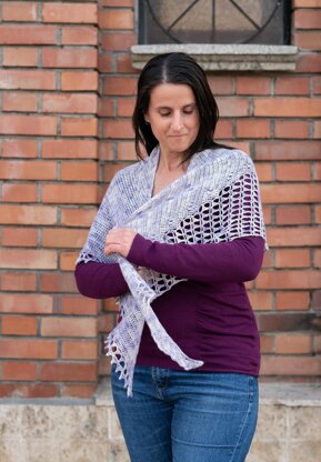 Clean lines create an elegant multi-seasonal shawl which can showcase the changing colors of a hand-dyed or variegated yarn without being overpowered by the stitch pattern, and not losing the stitch pattern in the yarn’s variegation.