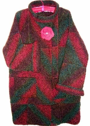 From a collection of 'easy knit' patterns created entirely from a combination of simple knitted squares, this coat is an extension of the original Winter Jacket pattern including two front pockets. A lovely warm coat for those chilly winter days. Overlapped at front and secured with shawl pin, or buttons/belts can be added to suit.