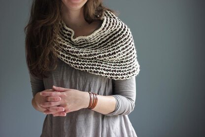 Cobbles Cowl is knit in the round and features 2 contrasting colors in a textured, open stitch (reminiscent of the cobblestones I see on the streets in Portland, Maine). Instructions are provided for both a long, infinity-style version as well as a short version that can also be worn around the shoulders.