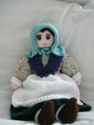 This is a knitted version of an island made ragdoll called Cobo Alice that was popular in Guernsey during the Victorian era. She was made by the Guille family who lived on the West coast of the island at Cobo, hence her name. The whole family including the children, were engaged in making these dolls, they became so popular. The original dolls had cloth bodies and clothing made from oddments of material in a variety of colours and a stockinette head. The doll was filled with sawdust and the head features painted on later, often rather crudely! This knitted version is an attempt to capture as many of the doll's original features as possible so that she will be instantly recognisable to the Islanders of Guernsey and beyond, but with a slight softening of her occasional startling features. She wears the traditional Guernseywomen's dress of the time, including the distinctive and elaborate sun bonnet (pronounced "bonnay"). The original dolls have mostly been lost, having been rotted a