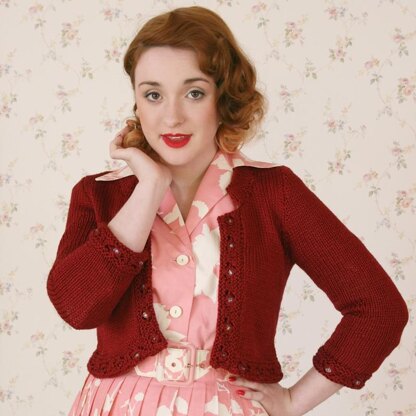 A short evening cardigan, designed for the party season. It features a beaded lace edging with folded hems for a really finished look.