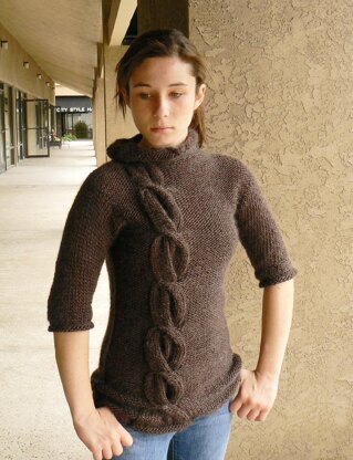 The Cocoon sweater knitted in rev st st with large asymmetrical cable and elbow length sleeves.
