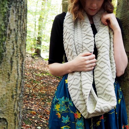 Coddle begins with the centre cable that is knit flat in one long strip then grafted together to make a cabled loop. Stitches are then picked up on either side of the centre cable and knitted outwards in the round to create ribbons of stitches flowing away from the centre. Coddle features both written and charted instructions.