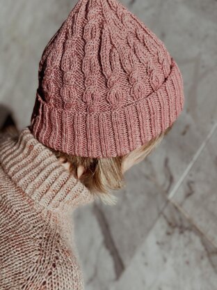 Fancy but comfortable cabled beanie in a form-fitting 2x2 rib background.