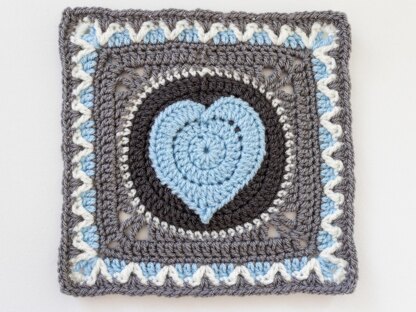 Cold Hands Warm Heart crochet square measures 10” and features a cute heart in the center.