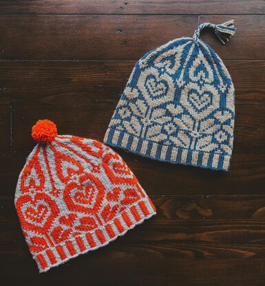 Knit in the round, this jaunty little hat features corrogated ribbing, sweet heart motifs and fun, slightly pointy shaping for when you’re feeling particularly jaunty. It can also be pulled down around the ears for a standard beanie fit. The pattern is written for 3 sizes, child, and adult short and tall versions. There are also 2 versions of the charts with reversed colors for easier knitting.