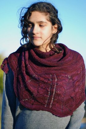 Coleus is a semi circular shawl edged in panels of leaf lace. The leaf lace pattern gives the edge a gentle scallop. It is worked beginning with garter stitch from the center top edge outward.