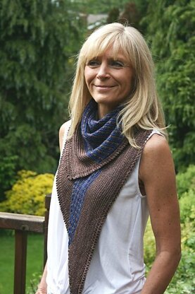 Collinear shawl is knit in a garter stitch. The eye catching stripe and slip stitch pattern makes it fun to knit and creates lots of different possibilities to wear it. Bias construction gives the shawl beautiful drape and the addition of a very fine saw-tooth edge adds a feminine touch to the piece.