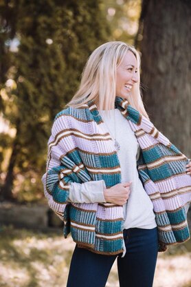 What makes this brioche wrap special is the fully reversible syncopated 4-color brioche design. Color changes are preceded by a group of garter stitches which make this syncopating process so easy to remember. The garter stitches are later decorated vertically, by pulling purple colored strands of yarn through the purl bumps. This beautiful piece is definitely what your closet needs this season.