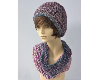 Two patterns - a pretty beanie hat and a matching cowl. They are knit with easily available Lion Brand Shawl in a Ball. The cowl can easily to worked as a long cowl to double around your neck - there is plenty of yarn. The yarn has long color changes