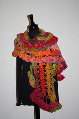 I was sorting my left over yarns according to colors and shades when they inspired me to create color gradients by using Bruges Crochet. Due to this crocheting technique the colors run in very narrow vertical lines. A brink of abundant quillings completes the scarf.