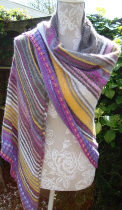 A colourful shawl in stocking stitch. The yarn changes are not done at the sides but in a straight line off center. This way the thread ends are not at the sides, making it easier to sew them in without showing. It also creates an interesting pattern.