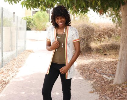 The colour stripe on this beautiful crochet mesh cardigan pattern makes it a happy garment to make and have. You can wear this cardigan as a beach cover-up or casually. It is easy to style also with accessories, and because the main colour is white, you could easily substitute the camisoles you wear