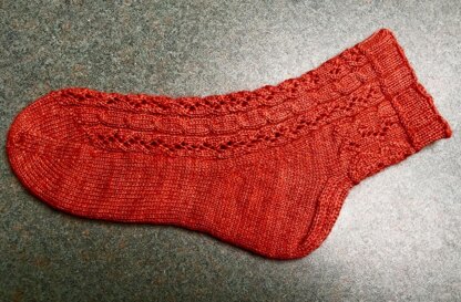 Comhar is a toe-up, magic loop pattern for a summer weight sock with sideways gusset and slip stitch faux heel flap. Sample shown is ankle height, but the sock is easily lengthened by adding pattern repeats. Only one stitch count is provided, but the elasticity of the pattern allows for foot circumferences from 6.75-9” by altering length.