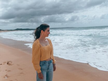 Perfect for everything from picnic dates to beach holidays, this classic duo will become a staple of your wardrobe. The fun stitch pattern, modern knit-look rib and flattering fit make it a beautiful feminine piece and the set offers a variety of mix and match styling options! The top is crocheted in a rectangle with options for a tie or button closure and straps are added after. The cardigan is crocheted from the bottom up with a V-neck, relaxed sleeves and a button band crocheted after.