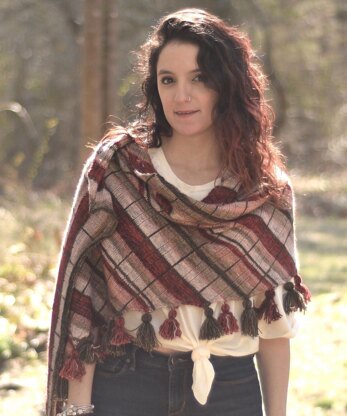 Confectionersis a large parallelogram wrap. Stripes are accented with a plaid-like stripe in slip-stitch crochet added during finishing. Although the shawl uses almost a full skein each of 5 colors of fingering weight yarn, it also might be a great way to use up all your little bits of leftovers!.