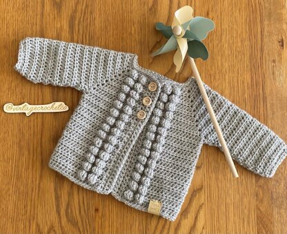 Worked from the top down in one piece, CONNIE is a bobble front baby cardigan in 3 sizes