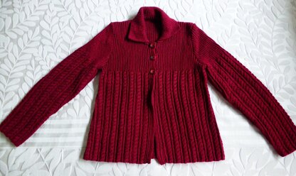 This ladies, plus sizes, Jacket has set in sleeves, side shaping and a collar. The body is worked in a four row cable pattern and the bodice is rib.