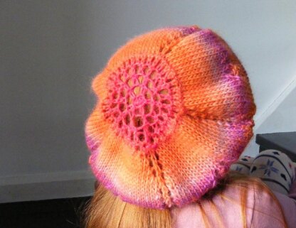 A top down slouchy beret style hat with a lace rose pattern at the crown. The yarn over increases and purl rows create the rose shape that gives the hat its name, conrós, meaning dog rose or wild rose as gaeilge. Yarn over increases divide the hat in five, each with a central wee lace rosebud pattern to compliment the crown. The self-striping effect of the yarn gives a lovely sunset effect. A slouchy fit should fit any large child or adult head. Knit here in Drops Big Delight on 5.5 mm needles, it uses less than one skein of yarn. Change to 5 mm for the 2 x 2 rib brim. Block the crown of the hat to show off the pretty lace rose at the centre of the yarn