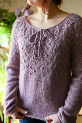 Knit seamlessly from the top down, this blouse is made by holding one strand of lace yarn and one strand of mohair together, creating a cozy yet lightweight fabric with a soft halo. The result is a comfortable, wearable piece that feels just as dreamy as it looks.