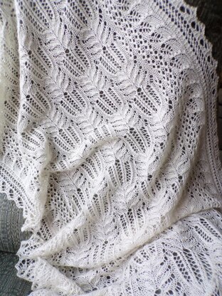 I designed "Contemplation" incorporating my favorite lace pattern Frost Flower. The main body is framed by a leaf and lace on the edges, the ends flow effortlessly into the continuation of lace and leaf patterns.