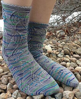 This picot hemmed sock has graceful, lacy curving ribs winding down the leg and onto the foot. The curves will bend your self-striping yarn and highlight your variegated yarn.