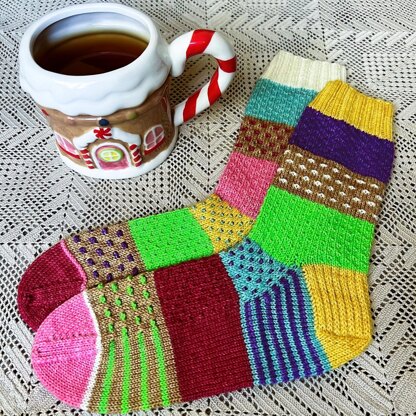 These fun scrappy socks use an eight skein mini set, or leftovers from your stash, with different texture and mosaic colourwork sections to highlight the scrappy colours! They were originally designed for a Gingersnapthat Advent set that had a cookie theme, so feel free to choose cookie inspired colours, or like the samples shown, colours with a gingerbread theme! Either way, they can reflect all the cookies we can imagine swapping at a cookie exchange!
