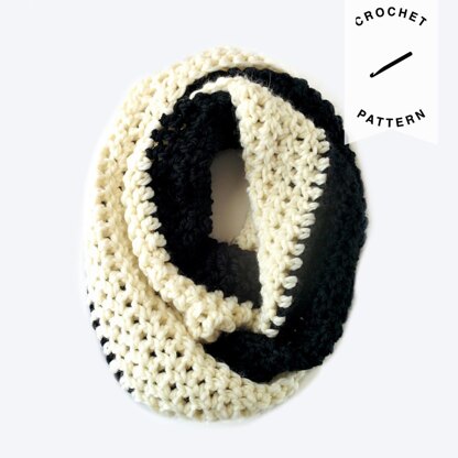 This Cookies & Cream infinity Scarf is a lush, warm infinity scarf that can be made in no time at all. It's a perfect pattern for beginners and uses simple stitches to create a thick and soft fabric. Unlike other long scarves, this one works up quickly and because it uses a large hook and easy stitches, it's great for any skill level. The scarf uses black and white yarn, but you can easily uses whatever colors you like. The result is an infinity scarf that is versatile and classic. You can wear it so only the white shows, or only the black, or a mix of both colors. This is the perfect pattern for holidays and last minute gifts!