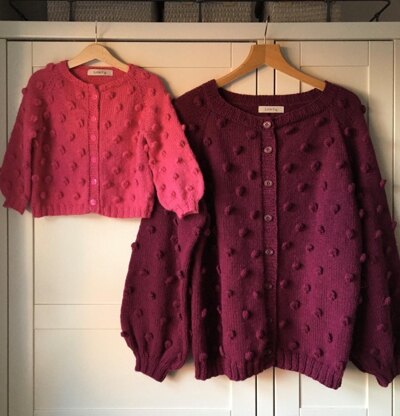 The cardigan is a loose fit, with a wide neck opening. The adult cardigan is worked with Aran weight yarn, whilst the child cardigan is worked with DK yarn.
