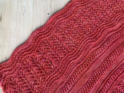 Finished dimensions: Approximately 68”/170 cm along the long edge and 42”/105 cm along the short edge, with an 18”/45 cm drop from the long edge to the point, before blocking. The pattern provides opportunities to make a smaller or larger shawl.
