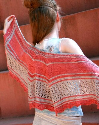 It starts with a lace edging for the lower and side edges, then decreases are used to create the angles that make the shape. There are lacy stripes of different textures that will show off a pretty yarn. It can be knitted using 2 complementary colors, or one solid or semi-solid color.