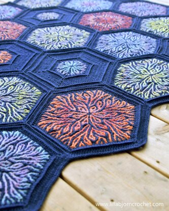 Coral Story Blanket uses brioche crochet technique and consists of hexagon motifs. Brioche crochet is very easy to do and it uses usual crochet stitches and chains. The pattern includes lots of progress pictures to help with stitch placement.